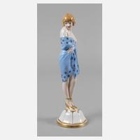 Fischer & Mieg Pirkenhammer, Entwurf Johanna Michel-Meier um 1920, undeutlich signiert, grüne Stempelmarke mit Zusatz Kunst-Abteilung 1910-1923, naturalistische Ausformung mit polychromer Aufglasurbemalung und Goldstaffage, auf gewölbtem Rundsockel stehende junge Frau, ihren Rumpf mit einem Handtuch verhüllend, Bobfrisur partiell fleckig und Vergoldung an den Schuhspitzen leicht berieben, H 27,5 cm.