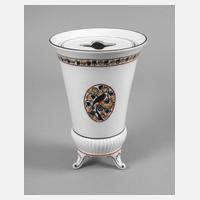 Entwurf um 1916, ungemarkt, Trichterform mit wulstartigem, vertikal geripptem Sockelbereich, drei eingerollten Füßen und Einsatz für Einzelblumen, verziert mit dreifachem medaillonartigen Vogelmotiv und einer Blattrankenbordüre in schwarzem Konturliniendruck mit gelb-roter Staffage sowie farbig korrespondierenden Randstreifen, minimale Herstellungsfehler, H 23,5 cm. Quelle: Susanne Fraas, Wachgeküsst, S. 126, Abb. 367 und CD-Rom Modellbuch Nr. 1139.