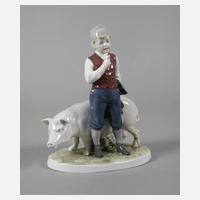 Entwurf Max Bechstein 1923, monogrammiert, grüne Stempelmarke 1918-1926, Ritznummer 9, naturalistische Ausformung und pastelltonige Unterglasurbemalung, auf ovaler Plinthe mit Rasenstück vor einem Schwein stehender Knabe, nachdenklich den Finger erhoben, Hand restauriert, sonst guter Zustand, H 22,5 cm.