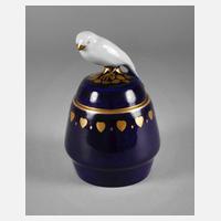 Entwurf Paul Klee vor 1916, grüne Stempelmarke 1919-1928 und Entwurfsstempel, Pinselnummer 23, leicht pilzförmiger Korpus mit Stülpdeckel und plastischem Knauf in Vogelform, verziert mit königsblau glasiertem Fond, umlaufender Herzbordüre in Goldmalerei sowie Goldstaffage und Goldrand, sehr guter Zustand, H 16,5 cm.