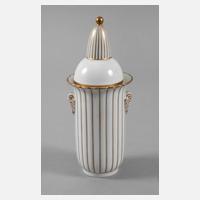 Entwurf Fachschule Selb/Fritz Klee attr. um 1919/20, grüne Stempelmarke der Kunstabteilung 1919-1928, Pinselnummer 18., zylinderförmige Deckeldose mit eingezogenem Stand, ausschwingender Mündung, zwei floralen Handhaben, baldachinartigem Stülpdeckel sowie linearer Goldstaffage, Vergoldung an der Mündung minimalst berieben, sonst guter Zustand, H 23,5 cm.