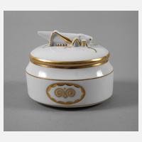 Entwurf Fritz Klee vor 1916, grüne Stempelmarke mit Zusatz Selb-Bavaria Abteilung für Kunst 1924-1939, Entwurfstempel und Pinselnummer 46, ovale Wandung mit abgekantetem Stand- und Mündungsbereich, beidseitigem ornamentalen Reliefmedaillon, flachem Stülpdeckel mit plastischem Insektenknauf, Goldstaffage und Goldrand, guter Zustand, H 9 cm.