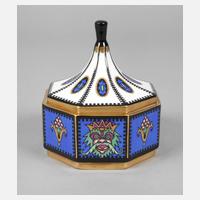 Entwurf Fritz Klee 1918, grüne Stempelmarke 1917-1925, Entwurfstempel und Pinselnummer 17, oktogonale Wandung mit abgesetztem Stand und zeltartig geformtem Stülpdeckel, alternierender Dekor aus stilisierter Maske bzw. Blütenmotiv und Ovalmedaillons auf dem Deckel in farbenfroher Aufglasurbemalung sowie Goldstaffage, guter Zustand, H 13,5 cm.