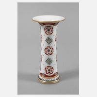 Formentwurf Max Schröder um 1914, unterglasurblaue Zepter- und rote Reichsapfelmarke vor 1945, geprägtes Monats- und Jahreszeichen für 1925 sowie weiteres Präge- und Pinselzeichen, leicht konische Form mit ausschwingendem Stand- und Mündungsbereich sowie abgesetztem Standring, umlaufend rapportierender Dekor aus stilisierter Blüte und Gitterraute in polychromer Emaillebemalung, Goldstaffage und Goldrand, sehr guter Zustand, H 20 cm.