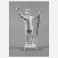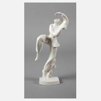 Entwurf Wilhelm Andreas 1921, signiert und datiert, schwarze Pinselmarke 1921-1942, geprägte Modellnummer P1099, abstrahierte Ausformung in Weißporzellan, auf oblongem Sockel auf einem Bein stehender Ausdruckstänzer in dynamischer Bewegung, neben ihm angeschmiegt ein tanzender Hund, seltene, partiell etwas brandfleckige Figur, H 35,5 cm.