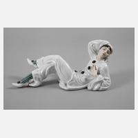 Entwurf Constantin Holzer-Defanti 1919, signiert, grüne Stempelmarke mit Zusatz Selb-Bavaria 1929, geritzte Modellnummer K.549., Prägenummer 13 und Malersignatur Schwalb, naturalistische Ausformung mit partieller Aufglasurbemalung, rücklings liegender Pierrot mit gekreuzten Beinen und aufgerichtetem Oberkörper in typischer Kleidung, guter Zustand, H 13,5 cm.
