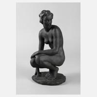 Entwurf Fritz Klimsch 1937, signiert, Prägemarke mit Zusatz classic Germany 1991-2002, naturalistische Ausformung in schwarzem Biskuitporzellan, auf unregelmäßiger Plinthe Aktdarstellung einer hockenden und seitlich blickenden jungen Frau, Podest etwas brandrissig und Plinthe mit durchgehendem Haarriss, H 36 cm.