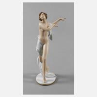 Entwurf Rudolf Kaesbach 1937, Ausführung 1948, signiert, grüne Stempelmarke mit Zusatz Germany Kunstabteilung Selb, geritzte Modellnummer 1655 und Prägenummer 19, naturalistische Ausformung in Biskuitporzellan, sogenanntes "Elfenbein poliert", auf quadratischer Plinthe mit Felsenstütze stehende nackte junge Frau in dynamischer Pose, einen Arm über den Kopf gehoben, ein kleiner Brandfleck auf der Schulter, sonst guter Zustand, H 37 cm.