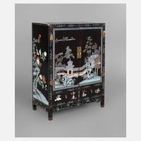 2. Hälfte 20. Jh., Lackarbeit auf schwarzem Fond und zarter Goldstaffage, mit Metallmontierungen, flaches, vierbeiniges Gestell mit zweitürigem Aufsatz, dieser figürlich verziert mit architektonischer Szene vor Landschaft, die Schmal- und Oberseite von Floralmotiven gesäumt, das Innenleben mit einem Regalboden sowie zwei zusätzlichen Schüben, kleinere oberflächliche Substanzverluste, Maße 123 x 90 x 45 cm.