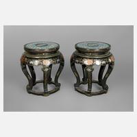 2. Hälfte 20. Jh., durchbrochen gearbeitete Sitzmöbel aus dunkler Lackarbeit mit filigranen Verzierungen in Gold, Blau und Koralle, die Sitzflächen eingelegt mit Tondo aus polychromen Zellenschmelzemaille, dessen Zentrum zeigt jeweils zwei Karpfen als stilisiertes Yin und Yang, gerahmt von Floralmotiven, H je 54 cm, D je ca. 45 cm.