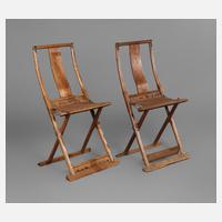19. Jh., Gestell aus massiver Ulme mit geschmiedeten Eisenmontierungen, x-förmiges, klappbares Gestell mit schmaler Sitzfläche aus Naturfasergeflecht, leicht konkav gebogte Rücklehne, stärkere Alters- und Gebrauchsspuren, H je 105 cm, SH je 57 cm.