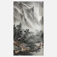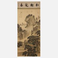 Ende 19. Jh., signiert und gestempelt, Gouache auf Seide, Darstellung eines einsamen Wanderers in Landschaft, Schmalseiten holzverstärkt, textil gefasst, teils stärkere Erhaltungsmängel, Maße 34 x 140 cm.