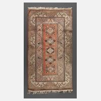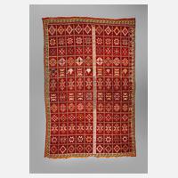 2. Hälfte 20. Jh., schachbrettartiger, geometrischer Dekor über rostrotem Fond, Mittelgrat und umlaufende Bordüre mit laufendem Hund, Randbeschädigungen, Altersspuren, Maße ca. 286 x 195 cm.