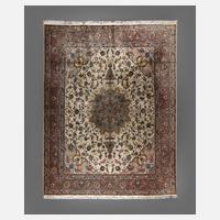 2. Hälfte 20. Jh., sternförmiges Mittelmedaillon über hellem Fond, leicht abgesetzter Randzwickel und mehrteiliger, breiter Bordürenbereich, gute Erhaltung mit leichten Altersspuren, Maße ca. 297 x 253 cm.