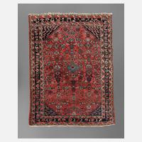 Mitte 20. Jh., detailreicher Streublumendekor über rostrotem Fond, mehrteiliger, dunkel abgesetzter Bordürenbereich, Fransenbesatz gekürzt, Ablaufspuren, Maße ca. 191 x 149 cm.