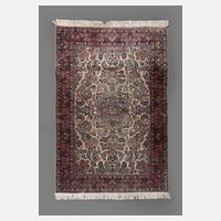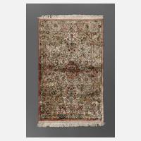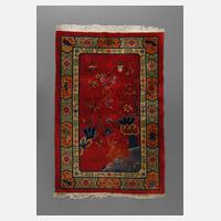 Mitte 20. Jh., farbenfrohes Modell mit figürlich gestaltetem Innenfeld, welches verschiedene Tiermotive zwischen Blütenzweigen zeigt, mehrstufiger, farbig abgesetzter Bordürenbereich verziert von Glückssymbolik, Fransenbesatz teils gekürzt, leichte Altersspuren, Maße ca. 240 x 152 cm.