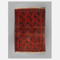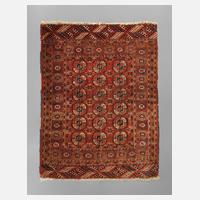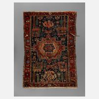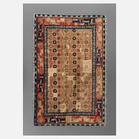 1. Hälfte 20. Jh., in kräftigem, rostrotem Kolorit gehaltenes Modell in typischem Dekor, das Mittelfeld verziert von rapportierenden Medaillons, mehrteiliger umlaufender Bordürenbereich, Fransenbesatz gekürzt, Alters- und Gebrauchsspuren, Maße ca. 123 x 119 cm.