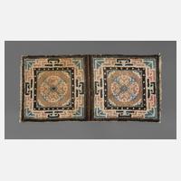 1. Hälfte 20. Jh., das hellgelbe Innenfeld verziert von Glückssymbolik und stilllebenhaften Elementen, blau und rostrot abgesetzter Bordürenbereich in korrespondierendem Dekor, Ablaufspuren, Schmalseiten gekürzt, Maße ca. 303 x 263 cm.