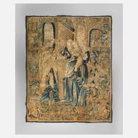 wohl 17. Jh., barocker, monumentaler gewirkter Wandbehang mit einer Vermählungsszene vor Architekturkulisse, gerahmt von breiter Bordüre, auf Leinen aufgezogen, stark verblichen, teils alt repariert, Maße 240 x 200 cm