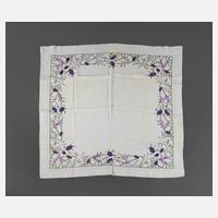um 1910, grobes Leinen mit umlaufendem Hohlsaum sowie handgesticktem Rispendekor in Violetttönen, etwas fleckig, Maße 140 x 145 cm.