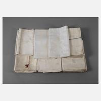 um 1900, 20 Stück, zum Teil mit gesticktem Monogramm, cremefarbener Halbleinendamast mit verschiedenen Motiven und teilweise Umschriften, verziert von floralen Darstellungen, Ornamentik und figürlichen Szenen, teil mit originalem Etikett, unterschiedliche Maße und Erhaltungen, Maße max. 105 x 48 cm.
