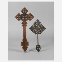 wohl Äthiopien, 19. Jh., leichtes Laubholz geschnitzt und graviert, durchbrochen gearbeitet und ornamental verziert, dazu Modell aus Bronze, dunkel patiniert, ebenfalls mit stilisiertem Zierrat staffiert, Altersspuren, L 31 und 43 cm.