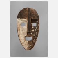 Kongo, 1. Hälfte 20. Jh., der Volksgruppe der Songye zugeordnet, Hartholz beschnitzt und zweifarbig gefasst, abstrahierte Gesichtermaske mit Öffnungen für Augen und Mund, komplett profiliert, Ösen für Textilbesatz, kleinere Substanzverluste, mit Aufsteller, H 40 cm