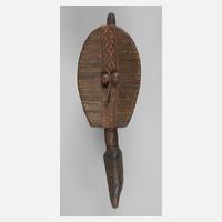 Gabun, um 1900, der Volksgruppe der Kota zugeordnet, schweres kupferummanteltes Holz, schildförmige, konkave Scheibe mit abstrahiertem Gesicht, H 48 cm.