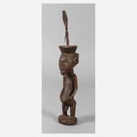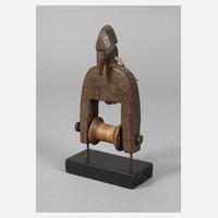 Mali, 2. Hälfte 20. Jh., der Volksgruppe der Senufo zugeordnet, leichtes Tropenholz mit Metallmontierung, bekrönt von Hornraben, auf späteren Sockel montiert, dieser mit altem Sammlungsetikett Dr. W. Nerlich München, H ca. 15 cm.