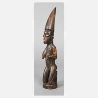 nzl., Yoruba/Nigeria, Tropenholz geschnitzt und dunkel gefasst, weibliche kniende Figur mit angedeutetem Spitzhut, auf flachem Rundsockel, Altersspuren, H 31 cm.