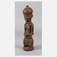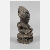 Nigeria, 19. Jh., Steinschnitzerei, dunkel gefasst, stilisierte weibliche Sitzfigur mit gekreuzten Beinen, ein Kleinkind auf ihrem Schoß haltend, verziert von geometrischen Tatauierungen, Altersspuren, kleinere Substanzverluste, H 25 cm.