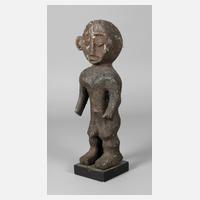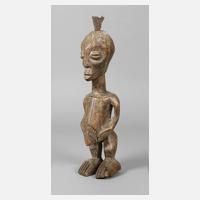 Westafrika, der Volksgruppe der Baule zugeordnet, Hartholz geschnitzt und rotbraun gefasst, vollplastische Darstellung einer stehenden Frau mit ausdrucksstarkem Gesicht, leicht berieben, H 40 cm.