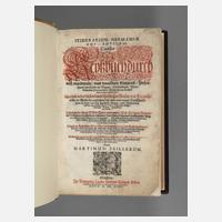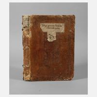 in qua continenturarticuli de fide, evangelio, virtutibvs et sacramentis: quorum materia iam nostra tempestate controverti solet, Augsburg bei M. Silbereysen 1531, Format 4°, 237 Blatt, Titel und letztes Blatt (Druckfehlerverzeichnis) in Fotokopie, zeitgenössischer geprägter Ledereinband, lateinische Ausgabe der 1528 erstmals erschienenen "Teutschen Theologey" des im Sinn der Gegenreformation tätigen B. Pirstinger, Bischofs von Chiemsee, mit altem klösterlichen Besitzvermerk 1565 (St. Magnus "in Faucibus Alpium" = Füssen im Allgäu), porös, am Rücken beschädigt, wurmstichig.