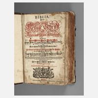 Biblia, das ist: die gantze heilige Schrift, deß Alten und Neuen Testaments wie solche von Herrn Doktor Martin Luther sel. [...], mit ganz Neuen und Schönen Kupffer-Bildnissen nebst denen selben beygedruckten Lebens-Läuffen[...], sammt einer Vorrede Herrn Johann Michael Dilherrns, Nürnberg bey Johann Andrea Endters seel. Sohn und Erben 1710, Format Gr. 4°, 26 Blatt , 1159 S. sowie ca. 24 fragmentarische Seiten im Anhang, viele Textkupferstiche, eine ganzseitige Tafel mit Bildnis Martin Luthers und seiner nächsten Familie, geprägter, braun übermalter Ledereinband mit Messigbeschlägen, Lederschließen fehlen, Rotschnitt, Buchblock lose, leicht wurmstichig, restaurierungsbedürftig.