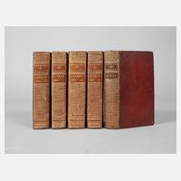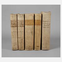 sacrae congregationis concilii quae consentanee ad Tridentinorum [...], 5 Bände mit folgenden Teilen: T. Tertius und Quartus, Urbini 1739/1740, 414 und 418 S.; T. Decimustertius/Decimusquartus und T. XV, Rom 1744/1745/1747, 244/135/124 S.; T. XXX und XXXI, Rom 1761/1762, 276/312 S.; T. XXXIV und XXXV, Rom 1765/1767, 248 und 310 S.; T. LXXXIV und LXXXV, Rom 1825/1826, 416 und 295 S., Schweinsledereinbände mit Rückenbeschriftung, mäßig wurmstichig, altersgemäß gut erhalten.