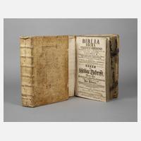 oder Heilige Schrift des Alten und Neuen Testaments, nach der uralten und in Latein gemeinen, auch von der Römisch/Katholischen Kirch bewährten Übersetzung, mit vorgesetztem lateinischen Text und neuen Summariis treulich auf jetzige Art zu reden, zum erstenmahl also eingericht von P. Thoma AQ. Erhard, Dritter Druck, 2 Bände, Augsburg bei Strötter und Sohn 1730, Gr. 4°, 12 Blatt, 905 S. (Volumen I), 732 S. 17 Blatt (Volumen II), auf dem fliegenden Vorsatzblatt handschriftlich bezeichnet: "Bartholomäus Trin in Kösching 1877", Schweinsledereinband, alt erneuerte Buchschließen, gering wurmstichig, Gelenk vom zweiten Band leicht eingerissen, Kapitale beschädigt, altersübliche Gebrauchs- und Lesespuren.