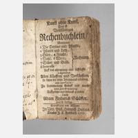 Kunst ohne Kunst, das ist vollständiges Rechenbüchlein/worinnen 1. die Zentner und Pfundt, 2. Stundt und Lot, 3. Ehlen, 4. Frucht, 5. Mehl, 6. Wein, 7. Silber und Gold, 8. Interesse auff das allergenau- und richtigste ausgerechnet [...] durch Adam Friedrich Scheffer 1735 Frankfurt am Mayn In Verlag Phil. Heinrich Hutters, Vorsatz nicht komplett, 214/81/84/72/126/144 und 82 S., Nachsatz fehlt, Format 12°, Ledereinband, handschriftliche Vermerke, leicht wurmstichig und stockfleckig, restaurierungsbedürftig.