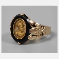 um 1880, Gelbgold gestempelt 585, ca. 17 mm hoher Ringkopf, besetzt mit einer fein gearbeiteten Gemme aus Glas mit der Darstellung eines römischen Kriegers, die Ringschultern durchbrochen gearbeitet, Tragespuren, RW 19 mm, G ca. 8,9 g.