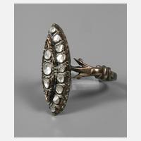 um 1880, Metall vergoldet, Ringkopf in Form einer 25 mm hohen Navette, besetzt mit zahlreichen Diamantrosen, wohl eine ergänzt, Tragespuren, RW 17 mm.