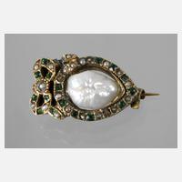 18. Jh., Gelbgold geprüft, 585/1000, besetzt mit einer barocken Perle, umgeben von einem Band aus Saatperlen und Smaragden sowie bekrönt mit einer Schleife, ein Smaragd fehlt, Maße ca. 22 x 13 mm, G ca. 2,7 g.