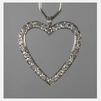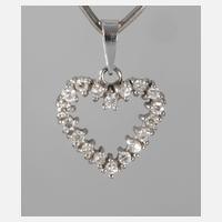 neuzeitlich, Weißgold gestempelt 585, herzförmiger Anhänger, besetzt mit Achtkantdiamanten im Gesamtgewicht von ca. 0,32 ct, Maße Anhänger 21 x 15 mm, G ca. 2 g.