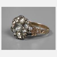 Ende 19. Jh., ca. 14 mm hoher Ringkopf, vollflächig besetzt mit verschieden großen Diamantrosen mit guter Brillanz, Ringschulter mit floralem Motiv, Tragespuren, RW 19 mm, G ca. 3,4 g.