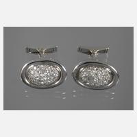 Ende 20. Jh., Weißgold geprüft 750/1000, ovale Form, besetzt mit zahlreichen Achtkantdiamanten in Pavéfassung, Knopfgröße 19 x 13 mm, G gesamt ca. 9,6 g.