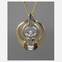 um 1970, Weiß- und Gelbgold gestempelt 585, besetzt mit sechs Brillanten von max. 0,15 ct, Maße Anhänger 33 x 25 mm, an ca. 50 cm langer Goldkette mit Federringverschluss, G gesamt ca. 15,3 g.