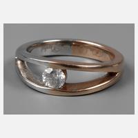 neuzeitlich, Rot- und Weißgold gestempelt 375 und Schriftzug "Ein Licht im Dunkel", sich teilende Ringschiene, besetzt mit einem Brillanten von 0,25 ct in guter Qualität, minimale Tragespuren, RW 16 mm, G ca. 4,2 g. Beigegeben Schmuckpass.