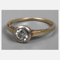 um 1910, Weiß- und Gelbgold gestempelt 585 und weitere Punzen, besetzt mit einem Altschliffdiamanten von ca. 0,6 ct in Zargenfassung, der Stein weist einen Spannungsriss auf, Ringschiene teilweise seitlich verziert, RW 18 mm, G ca. 2,8 g.