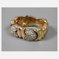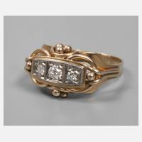 neuzeitlich, Weiß- und Gelbgold gestempelt 585, geschwungene Ringschiene, besetzt mit 5 Brillanten im Gesamtgewicht von 0,09 ct, leichte Tragespuren, RW ca. 17 mm, G ca. 2,1 g.