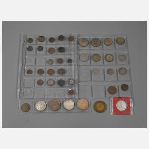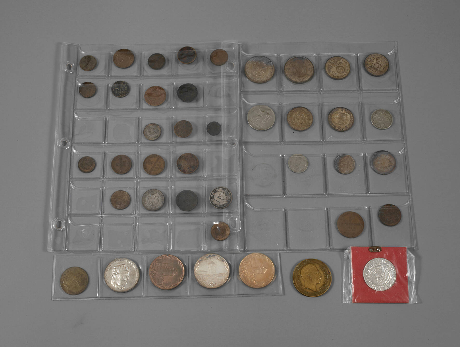 besammelt mit Kleinmünzen und Medaillen 18.–20. Jh., 34 Stück Kleinmünzen im Album, darunter 1 Pfennig Sachsen 1775 C, 4 Pfennig Paderborn 1718, 5 Pfennig Danzig 1923, weitere Pfennige Altdeutschland 19. Jh., 2 RM Luther, 5 RM Hindenburg 1936, 5 RM Garnisonskirche 1934, 2 RM Hindenburg 1937, 2 RM Garnisonskirche 1934, jeweils unterschiedliche Umlauferhaltungen, sowie 7 Medaillen einzeln, dabei Jeton "Friedrich III. Koenig von Preussen – Gesegnet sey durch ihn ein Ganzes Volk" um 1814, Messingmedaille "Zum Gedächtnis der Aussöhnung – Otto von Bismarck – Wilhelm II." 1894, Silbermedaille der Schillerehrung 1955 "Wir wollen sein ein einzig Volk von Brüdern", Satz Medaillen "750 Jahre Oelsnitz" Gold, Silber und Bronze und Gedenkmünze des im Frohnauer Hammer geprägten "Schreckenberger" auch Engelsgroschen, im Plasteetui.