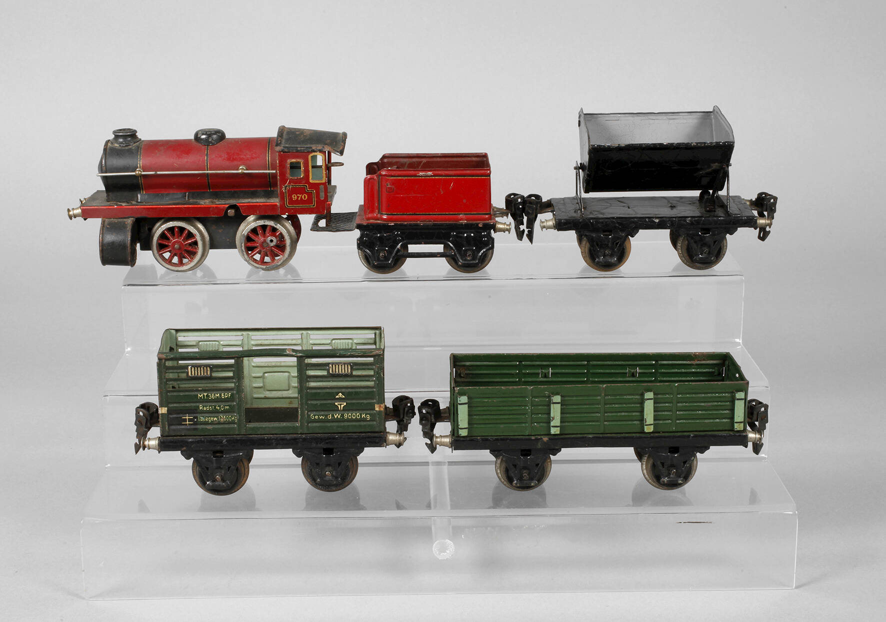 um 1930, gemarkt und meist bezeichnet, Blech farbig lithografiert, Spur 0, bestehend aus rotbrauner Schlepptenderlok 970, Uhrwerkantrieb intakt, nur vorwärtsfahrend, Hand- und Automatikschaltung, Galeriestange und Tender, dazu Hochbordwagen, Viehwagen 1969N mit seitlicher Öffnung und schwarz-grau lackierter Kippwagen 1972 mit Sperrvorrichtung, alle zweiachsig und mit hellen Puffern, dazu originaler Schlüssel, teils stärkere Alters- und Gebrauchsspuren, beide Schubstangen lose, eine Galeriestange und Wagendach fehlen, L Lok inkl. Tender 25 cm, L Wagen je 13 bzw. 16 cm.