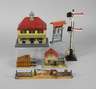 1920/30er Jahre, teils gemarkt, Blech und Guss farbig lackiert bzw. lithografiert, meist passend zu Spur 0, bestehend aus zweiflügeligem Bing Hauptsignal mit zwei Laternen und Karl Bub Bahnhof mit imitierter Turmuhr, beide elektrifiziert und funktionstüchtig, Bing Richtungsanzeiger sowie einschrankigem Bahnübergang mit Handkurbel, Wärterhaus und Prellbock, unterschiedliche Alters- und Gebrauchsspuren, Schranke gelötet, H Signal 36 cm, H Bahnhof 23 cm.